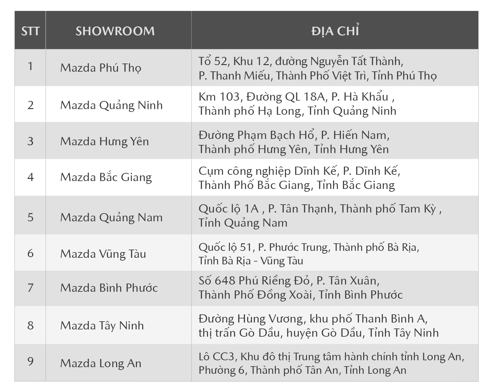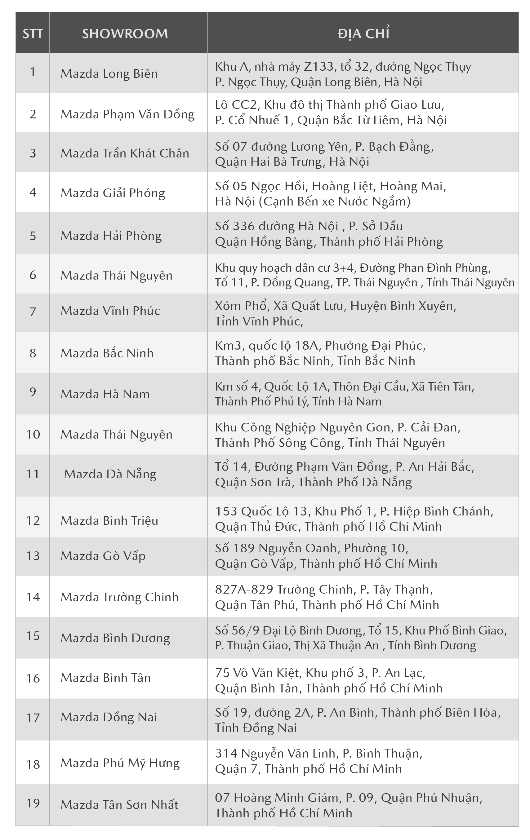 (*) Để có thêm thông tin chi tiết, Quý khách vui lòng liên hệ các Showroom Mazda nằm trong danh sách bên dưới để được tư vấn cụ thể hơn.