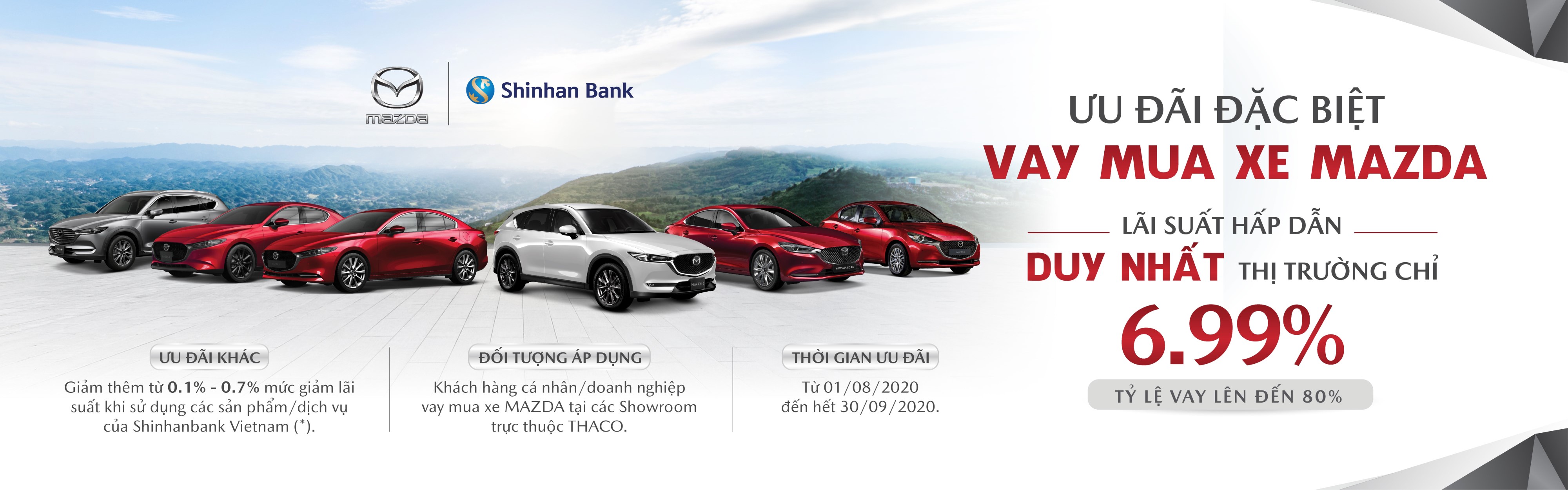 Nhằm đồng hành và hỗ trợ khách hàng vay mua xe Mazda trong Qúy III, từ 01/08/2020 đến hết ngày 30/09/2020, THACO đã phối hợp cùng đối tác Shinhan Bank Vietnam xây dựng và cung cấp cho khách hàng gói giải pháp tài chính tối ưu nhất với các đặc quyền ưu đãi về lãi suất duy nhất trên thị trường (áp dụng đối với các hồ sơ vay được phát hành Thông báo cho vay trước ngày 30/9/2020).